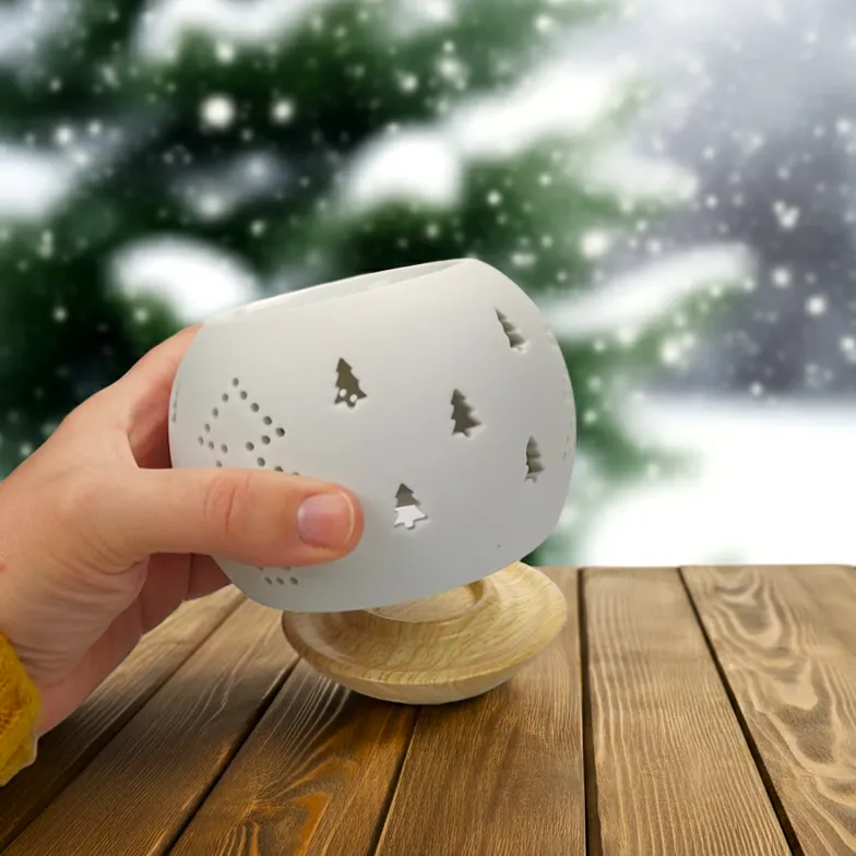 Odkryj magię świąt z naszym ceramicznym kominkiem do wosków i olejków eterycznych Makandulo. Wyjątkowy wzór choinki, elegancko wygrawerowany na białej ceramice, przeniesie Cię w serce zimowej atmosfery. Ten okrągły kominek z zdejmowaną, drewnianą podstawką jest nie tylko praktycznym elementem dekoracyjnym, ale i symbolem domowego ciepła oraz radosnego nastroju świątecznego.