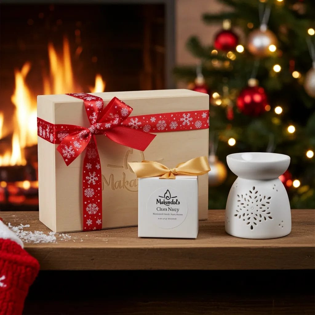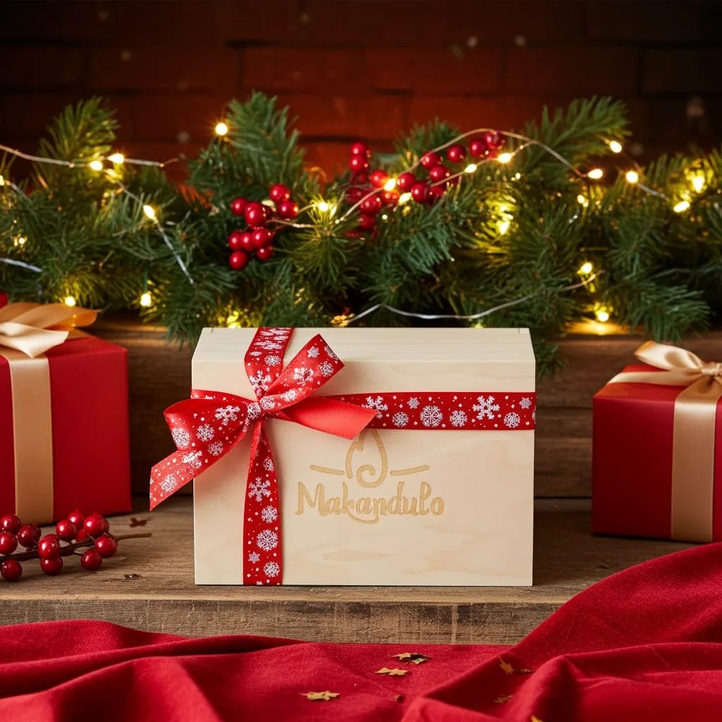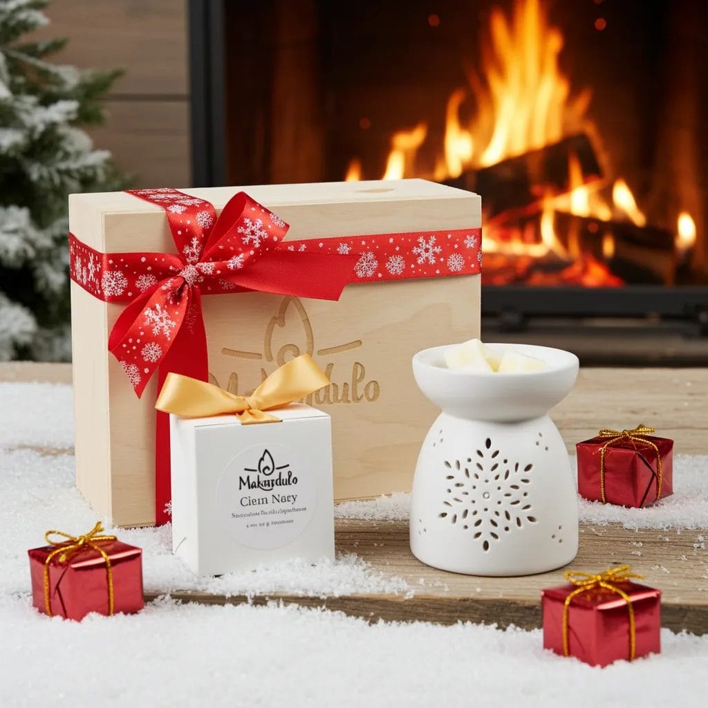 Szukasz gotowego prezentu pod choinkę, który wygląda elegancko i wypełnia dom zapachem Świąt? Ten zestaw w drewnianej skrzyneczce z kominkiem i woskami Makandulo oszczędza Twój czas — wystarczy położyć go pod choinką.