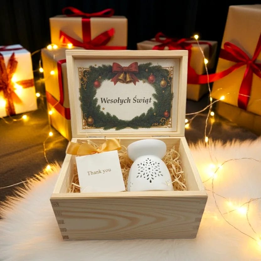 Drewniana skrzynka z dedykacją „Wesołych Świąt” i świąteczną wstążką sprawia, że zestaw jest w 100% gotowy do wręczenia. Nie trzeba nic pakować ani kompletować — idealne rozwiązanie dla zabieganych i dla tych, którzy chcą mieć pewność, że prezent będzie wyglądał perfekcyjnie.