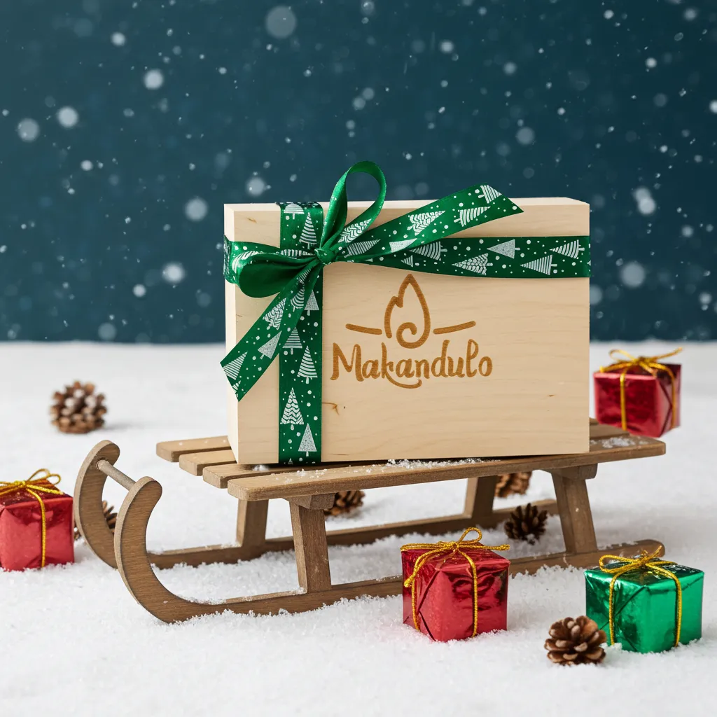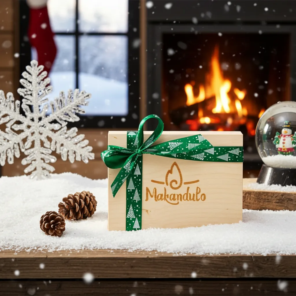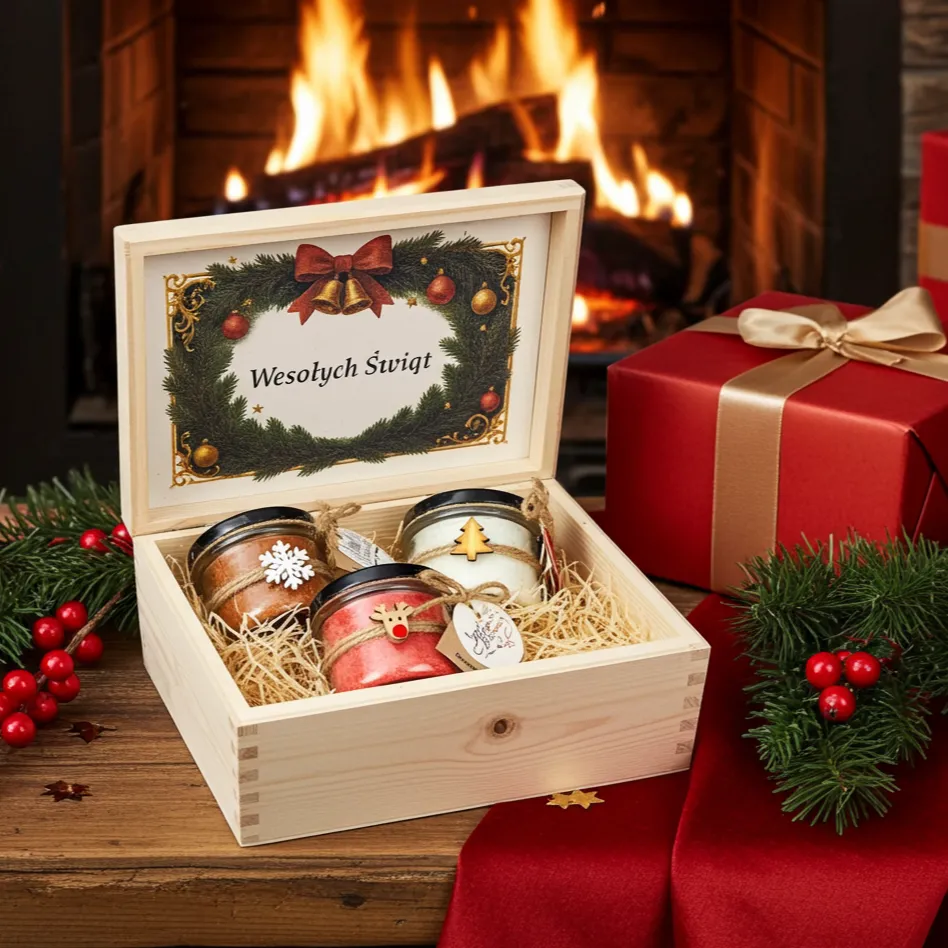 Elegancka drewniana skrzyneczka z trzema naturalnymi świecami Makandulo. Starannie dobrany zestaw świątecznych aromatów — gotowy do wręczenia na prezent.